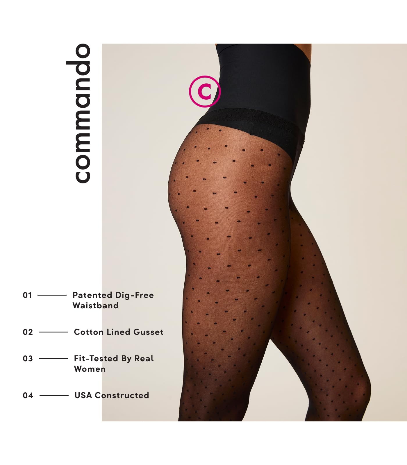 commando Chic Dot Sheer Tights | Sheer Hosiery with Polka Dot Pattern | Patented Raw-Cut, Dig-Free Smoothing Waistband | Black, Large