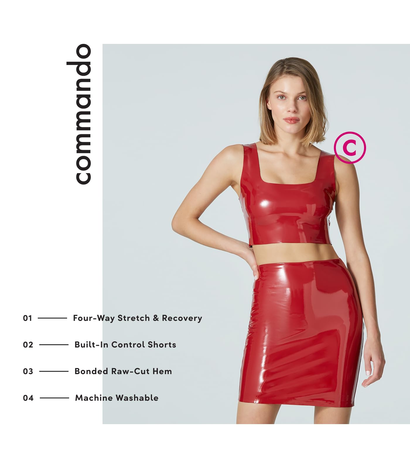 commando Faux Patent Leather Mini Skirt | High‑Shine Vegan Patent Skirt with Built‑in Smoothing Shorts & Raw‑Cut Edges | Lava, X-Large